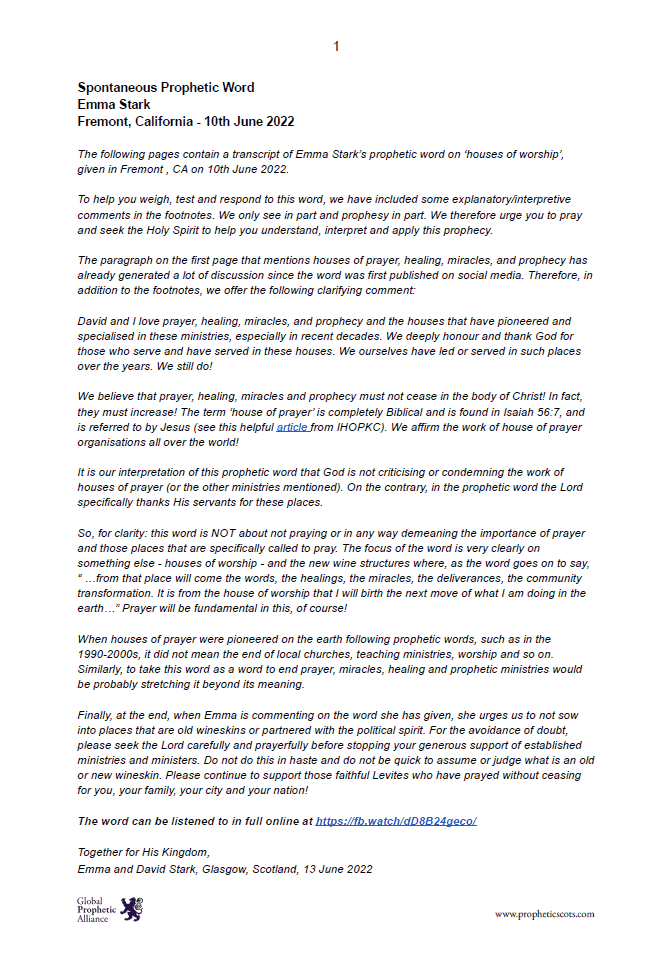 The following pages contain a transcript of Emma Stark’s prophetic word on ‘houses of worship’, given in Fremont , CA on 10th June 2022.